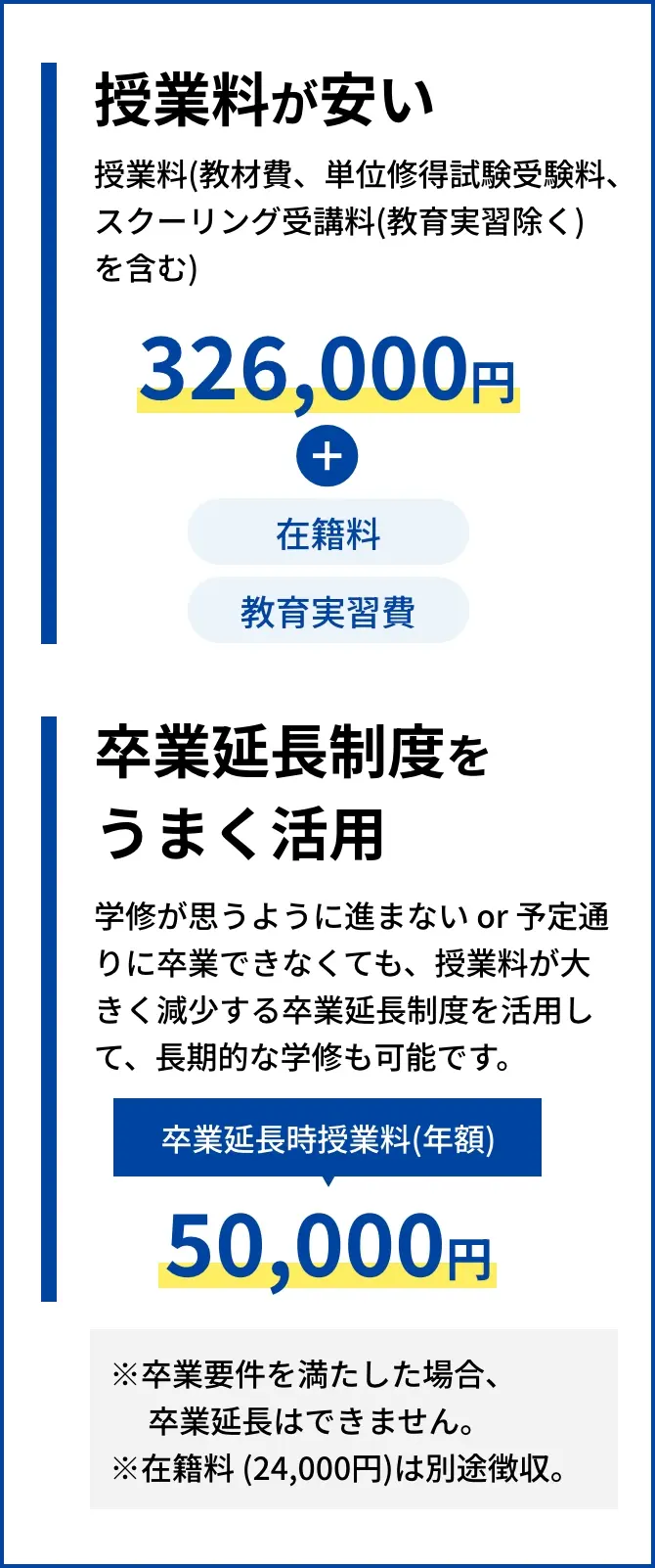 シンプルな学納金設定なので安心! - 基本的な学修費用(教材費・スクーリング受講料・単位修得試験受験料)はすべて授業料に含まれます!