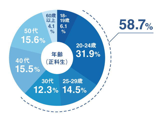 ①年代分布:20代・30代が全体の半数以上。キャリアアップのために学びたいと思う学生が多くいます。在籍者数(正科生)は約3,700名。年々増加しています!※